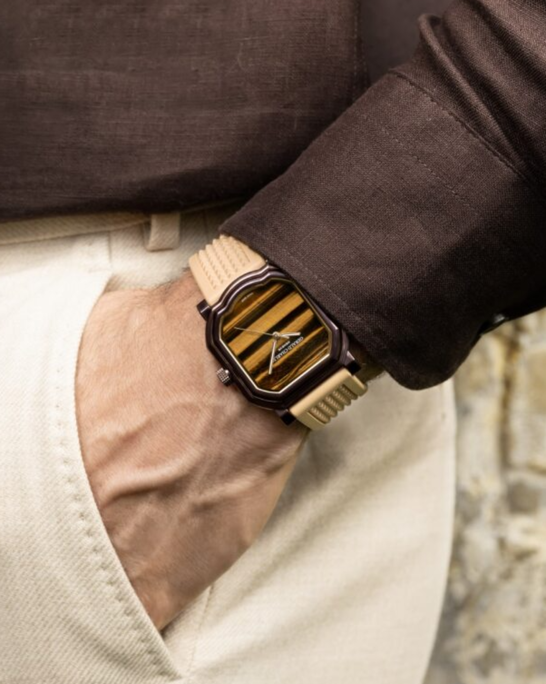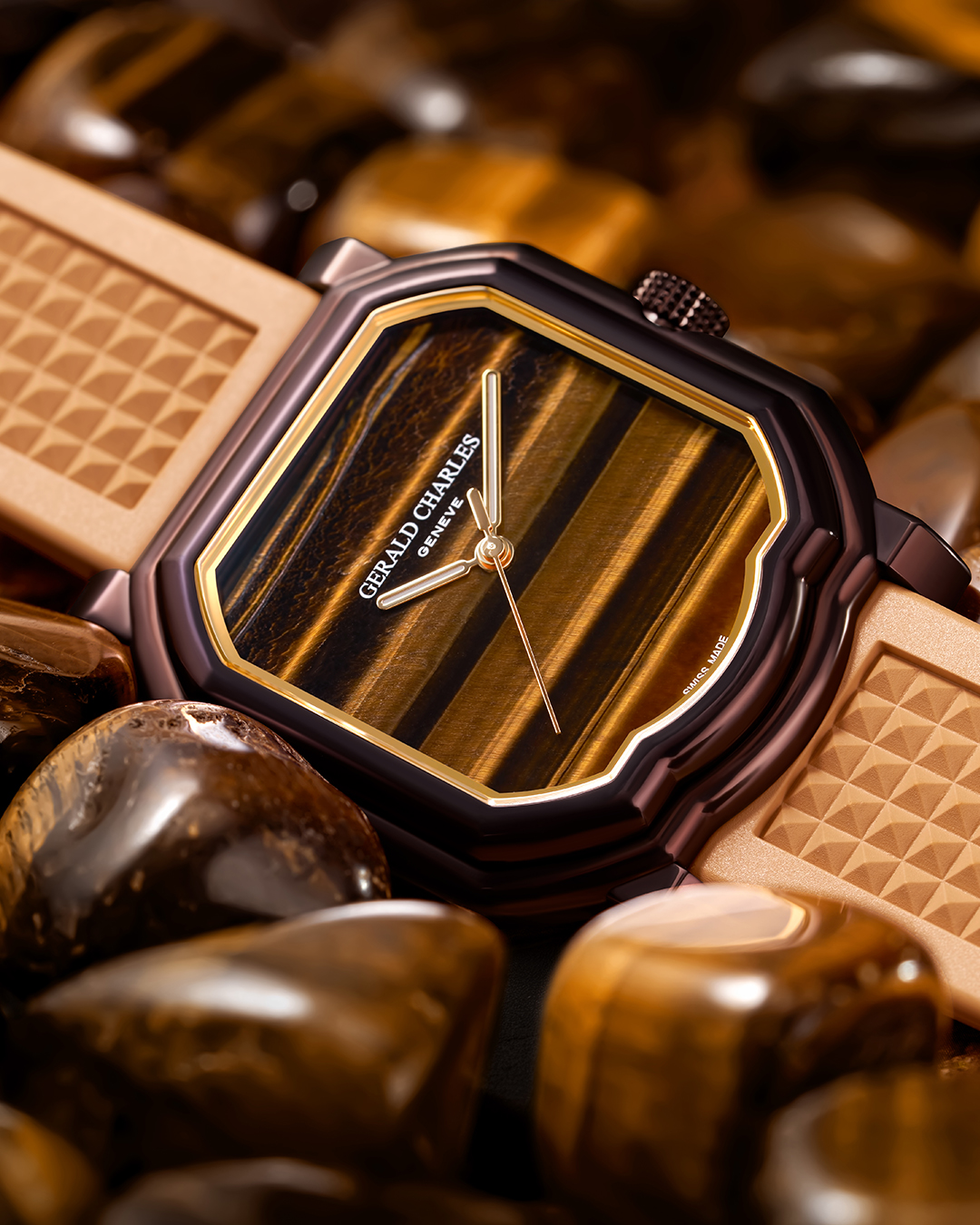The stone is framed by the brand’s iconic Maestro case, known for its fluid, architectural lines. For this edition, Gerald Charles debuts its first-ever Colormix finish on the case, a metallic bronze brown achieved through a proprietary blend of chemical and physical treatments. Previously used only on internal components, the finish has been specially reinforced for external application, lending the case a distinctive warmth and scratch resistance. This deep brown tone is echoed on the buckle and paired with a sand-toned vulcanised rubber strap, whose matte, lightly textured finish evokes the golden landscape of the UAE. Together, the dial, case, and strap form a cohesive visual story, blending heritage and modernity, craftsmanship and natural beauty.