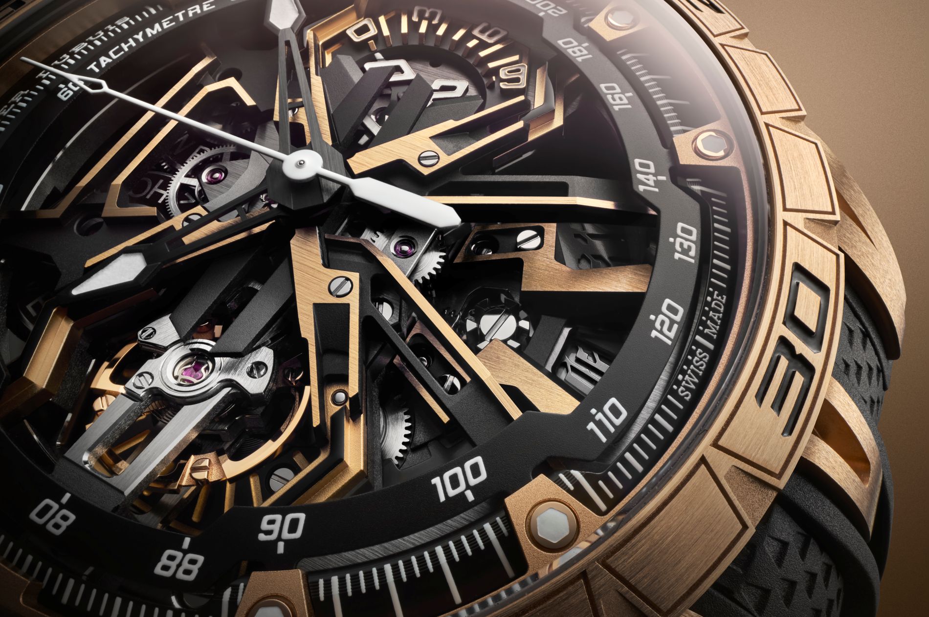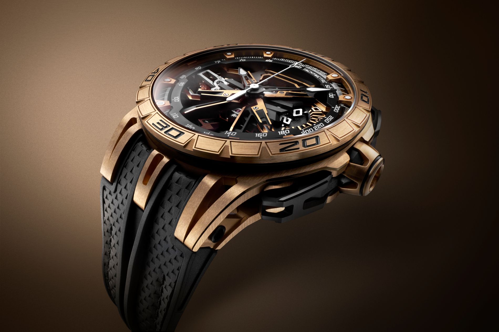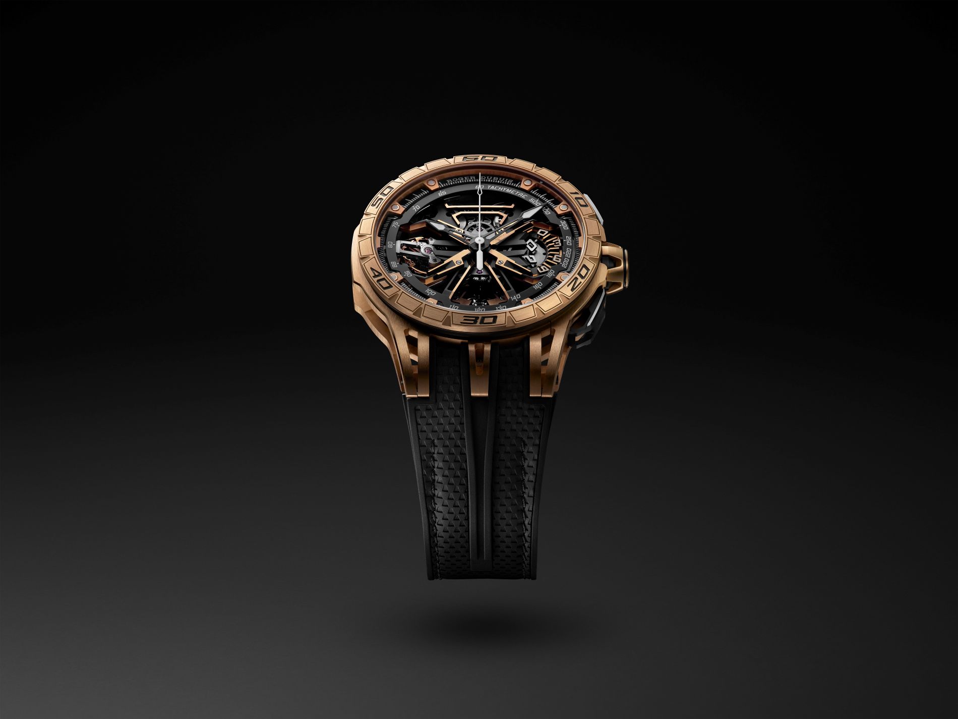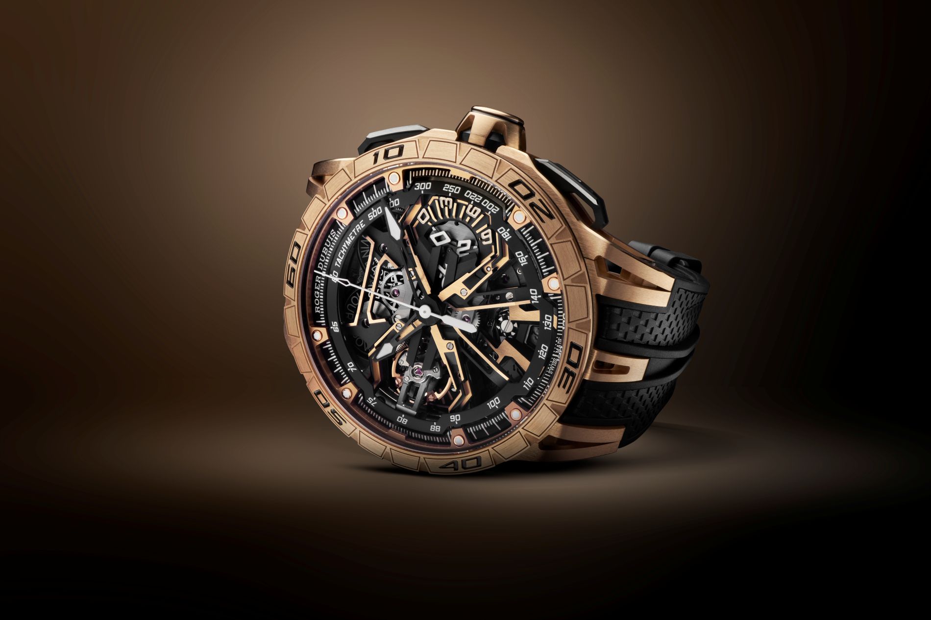 Connecting the watch with the chronograph’s motorsport DNA, the rotor on the caseback has been shaped with five arms, like the rims of a supercar’s wheel, which are further accentuated with the signature sharp lines of Roger Dubuis.