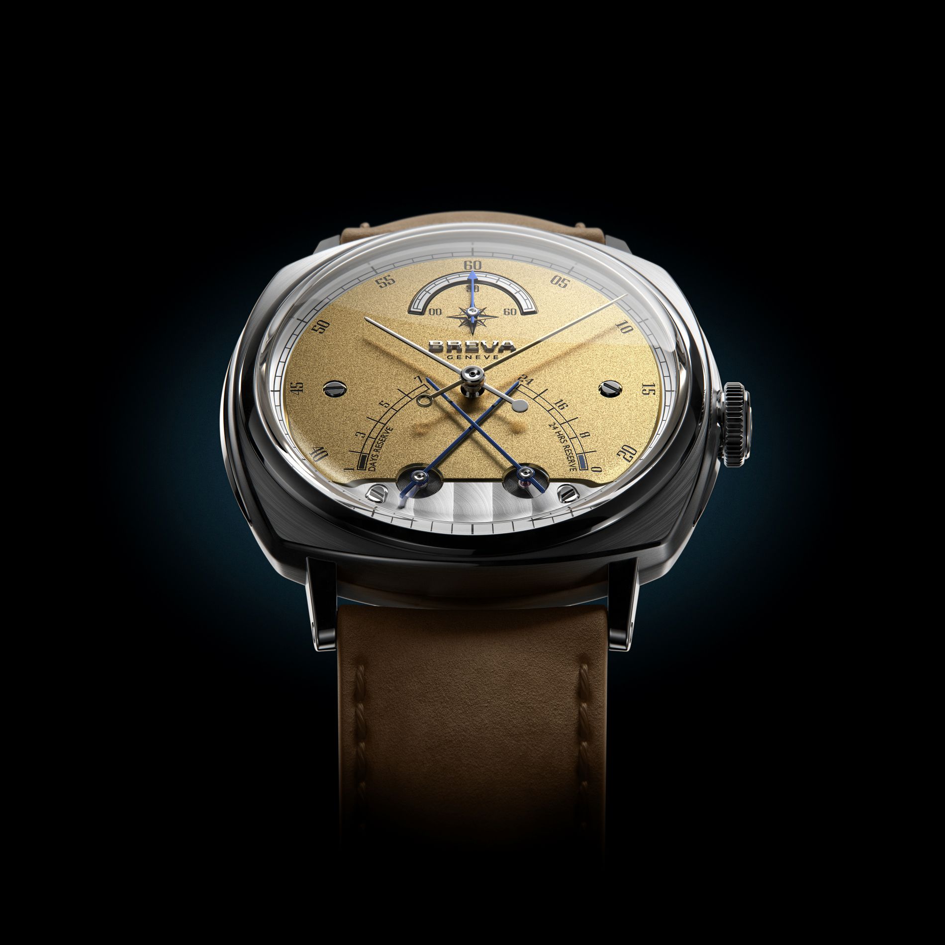 تستلهم بريفا جنيف هنا من جمالية مرتبطة ارتباطًا وثيقًا بتاريخ القياس. فالمينا المزخرف بانعكاسات ناعمة، ومؤشر اتجاه الرياح عند الساعة 12، والمقاييس المتقاطعة للمؤشرات الرجعية، كلها تشير إلى اللغة البصرية للأدوات العلمية.