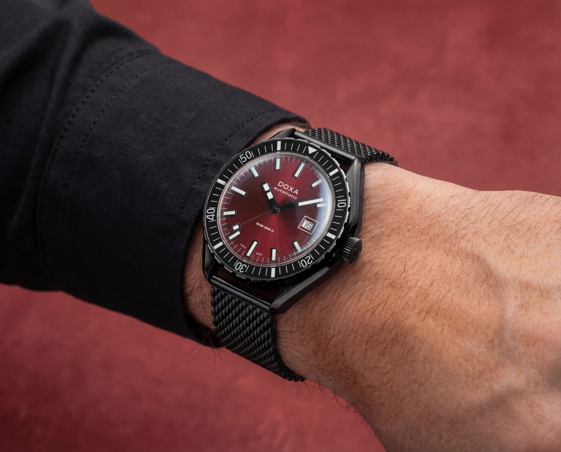 يُضاف إلى هذه المجموعة تصميمٌ أكثر جرأة: ساعة SUB 200 II مطلية بالكامل بطبقة DLC سوداء – العلبة والإطار والتاج – مع ميناء أحمر داكن جديد يُسمى Redcoral. يمنح اللون الأسود الكامل الساعة حضورًا قويًا وجذابًا، يكاد يكون أحادي اللون، بينما يضفي عمق الميناء لمسة دافئة أنيقة.