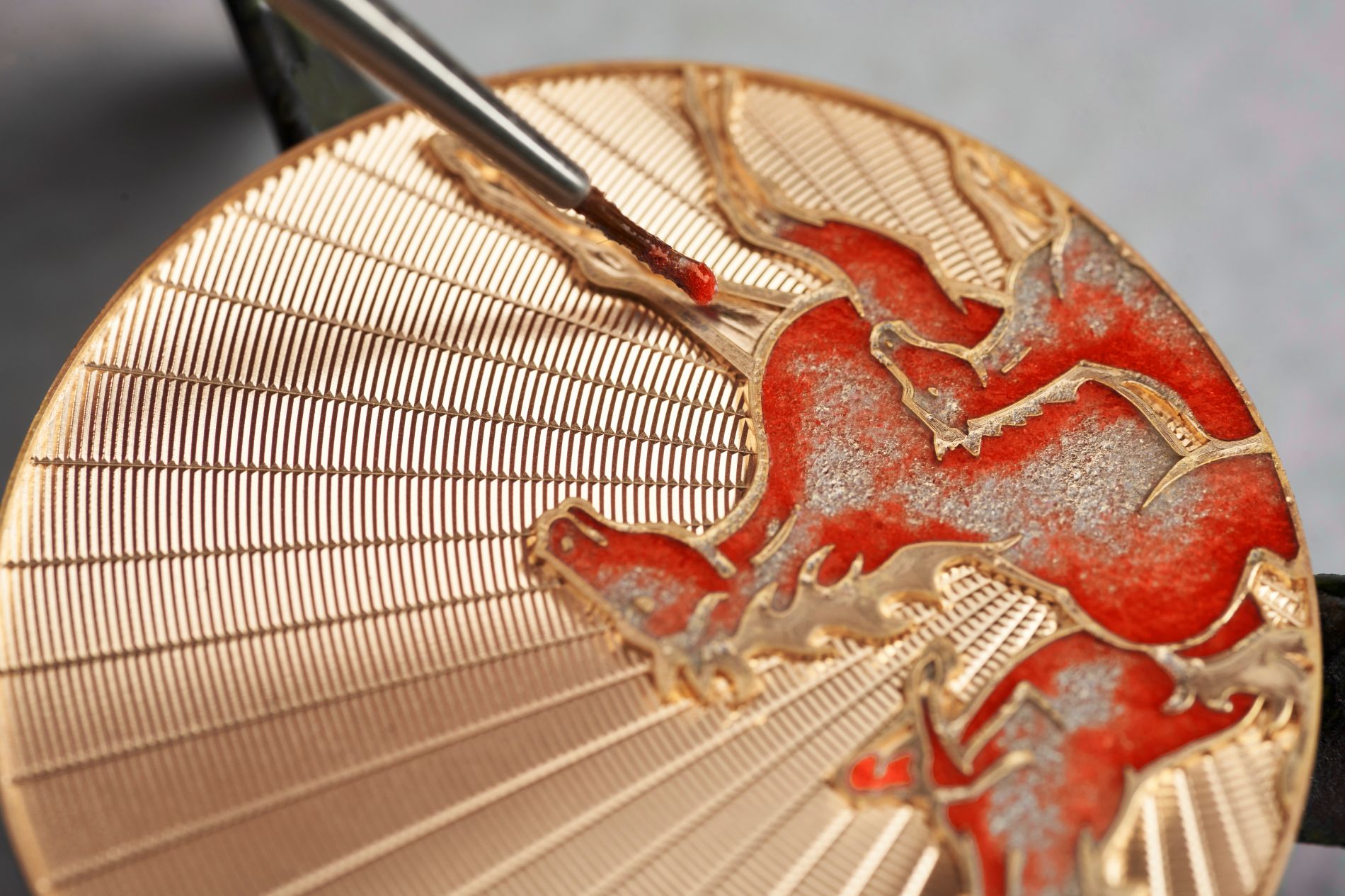 تم تزيين المينا بمزيج من أشعة الشمس والزخارف الدائرية، والتي تم تنفيذها ببراعة يدوياً باستخدام مخرطة محرك الوردة التقليدية.