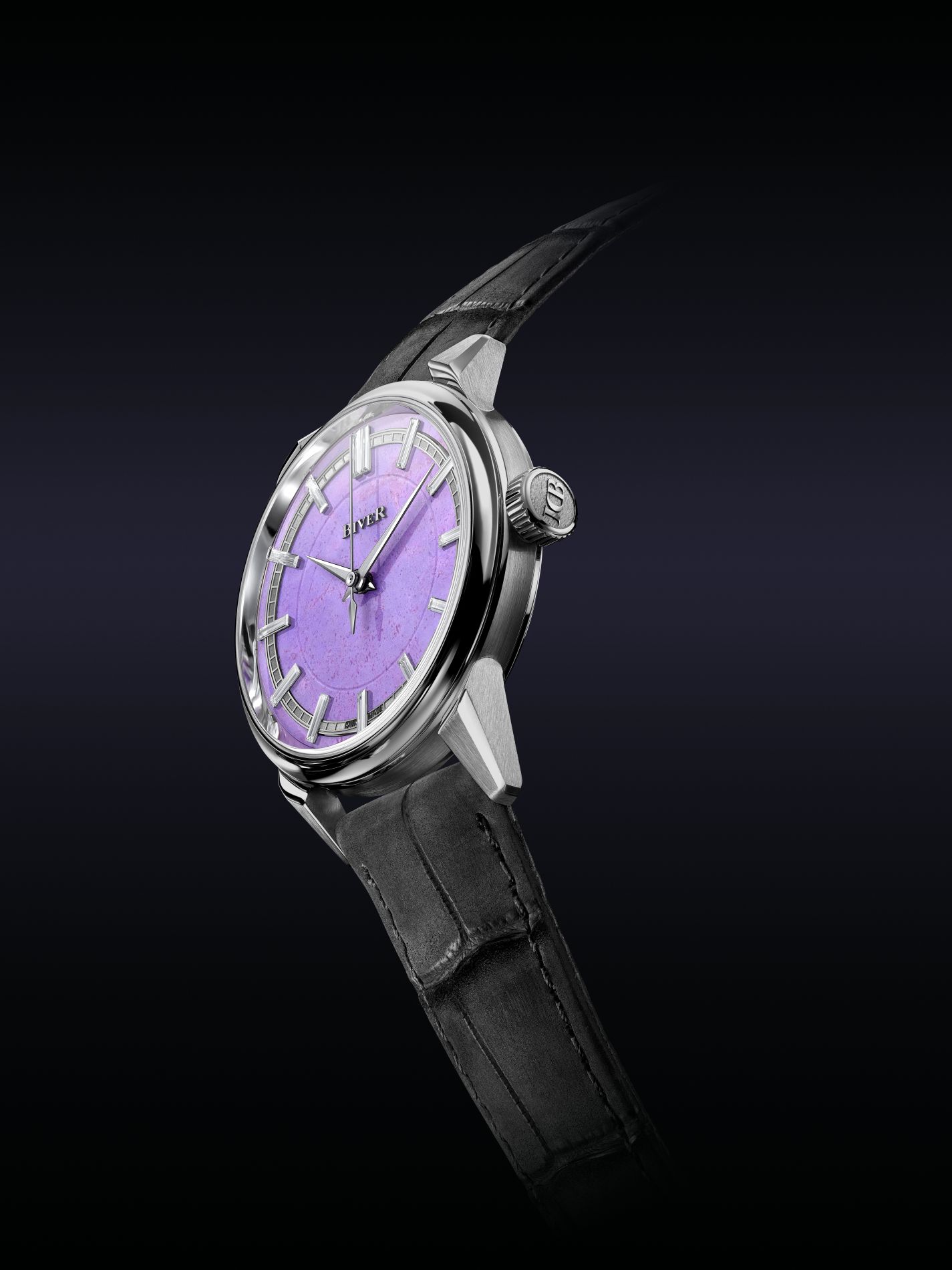 The other two new stones are blue quartzite and lavender jade, both of which are paired with platinum cases to allow the bright colours and subtle textures to shine. Quartzite looks almost like the surface of a frozen lake after a light snowfall. Icy blue is flecked with slightly glossy fragments of white and darker blue veins add additional depth. Lavender jade is even more subtle, with a semi-matte finish in a delicate pink-and-purple hue, with subtle dark spots showing the stone’s natural structure.