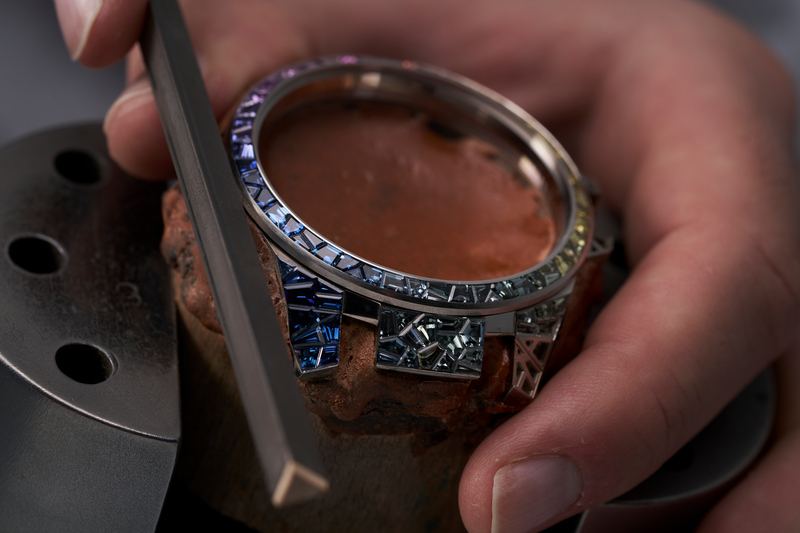 Throughout, the stones appear to be set randomly, a look achieved by using 85 different, unique cuts. Furthermore, each stone is invisibly set by hand into the watch, using a rare métier d’art technique known as “mystery setting” that requires a special cut to create the magical impression that the sapphires are floating. The stones are held in  place from below by a hidden structure so that no white gold is visible from above. At the same time, the setting allows more light to pass through the stones so that the  watch shines and shimmers with beguiling brilliance.
