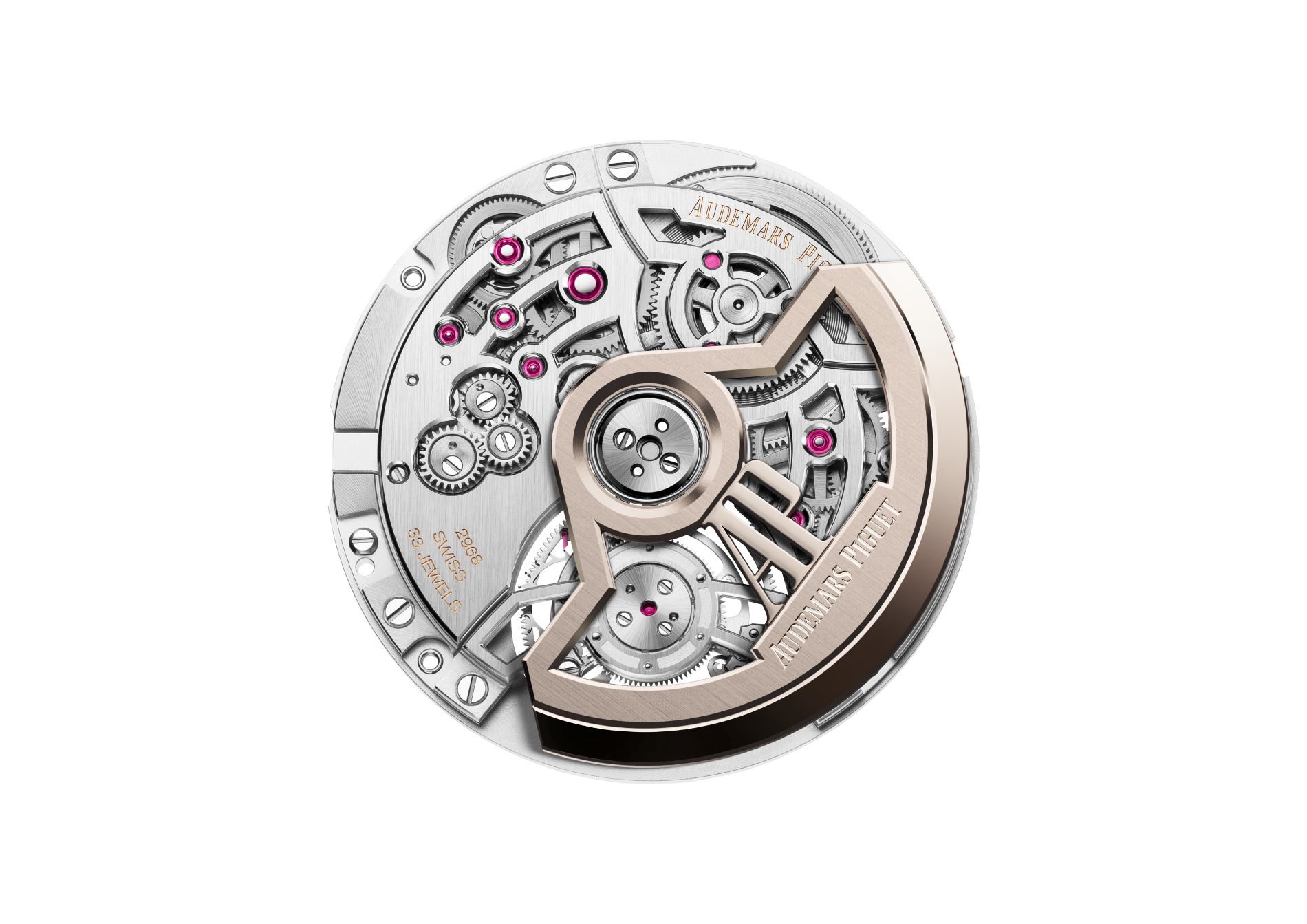 The flying tourbillon cage of Calibre 2968 has been designed with thinness, harmonious aesthetic and performance in mind. In addition to repositioning several components compared to previous flying tourbillon movements, the AP teams incorporated a new escapement to drive the titanium cage peripherally, improving energy distribution to the tourbillon, while lightening and refining this regulating organ.’ In addition, the escapement relies on an oscillator with increased amplitude that pushes the limit at which knocking occurs— a state which happens when excessive energy is transferred from the escapement to the oscillator-and enhances reliability, energy efficiency and precision.
