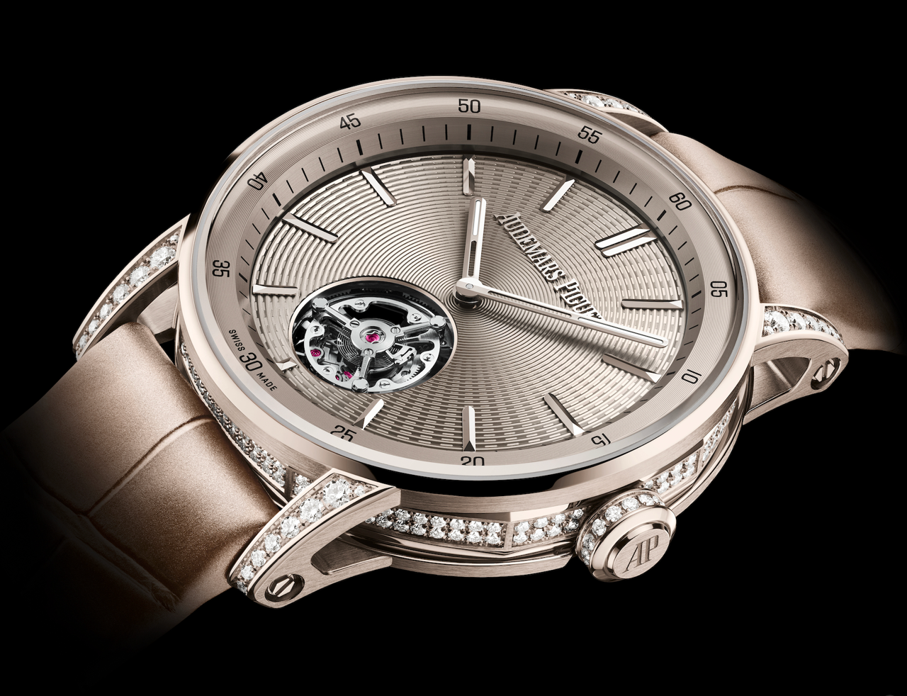 Reflecting the finesse of the movement it houses, the new Code 11.59 by Audemars Piguet Selfwinding Flying Tourbillon is dressed in an elegant sand gold case set with diamonds that comes to life with every movement of the wrist. This 18-carat alloy, which combines gold with copper and palladium, makes its first appearance in the Code 11.59 by Audemars Piguet collection this year, following its debut in the Royal Oak in 2024. Hovering between white and pink gold depending on the light and the angle, this material accentuates the endless play of light created by the case’s multifaceted architecture and the subtle alternation of satin-brushing and polished chamfers that embellishes its surfaces.