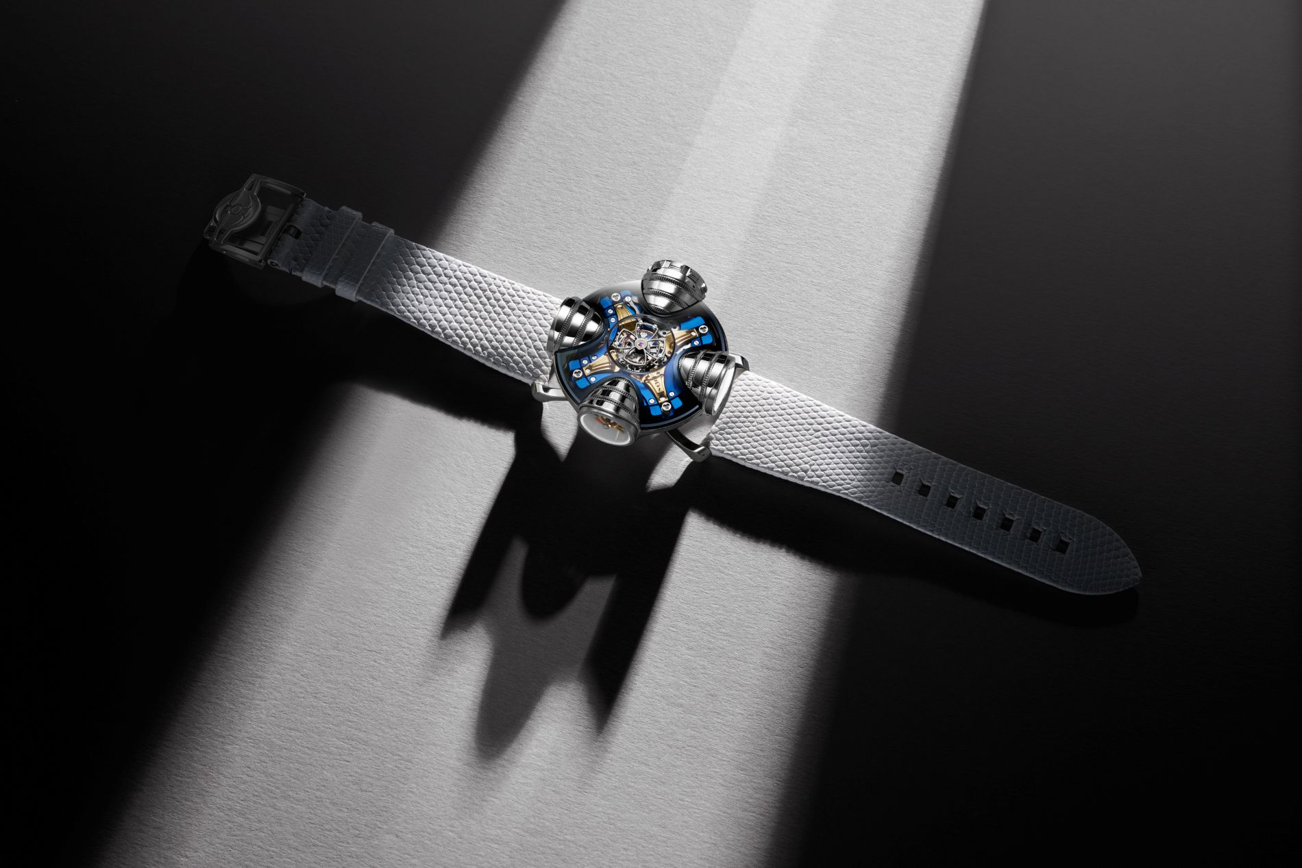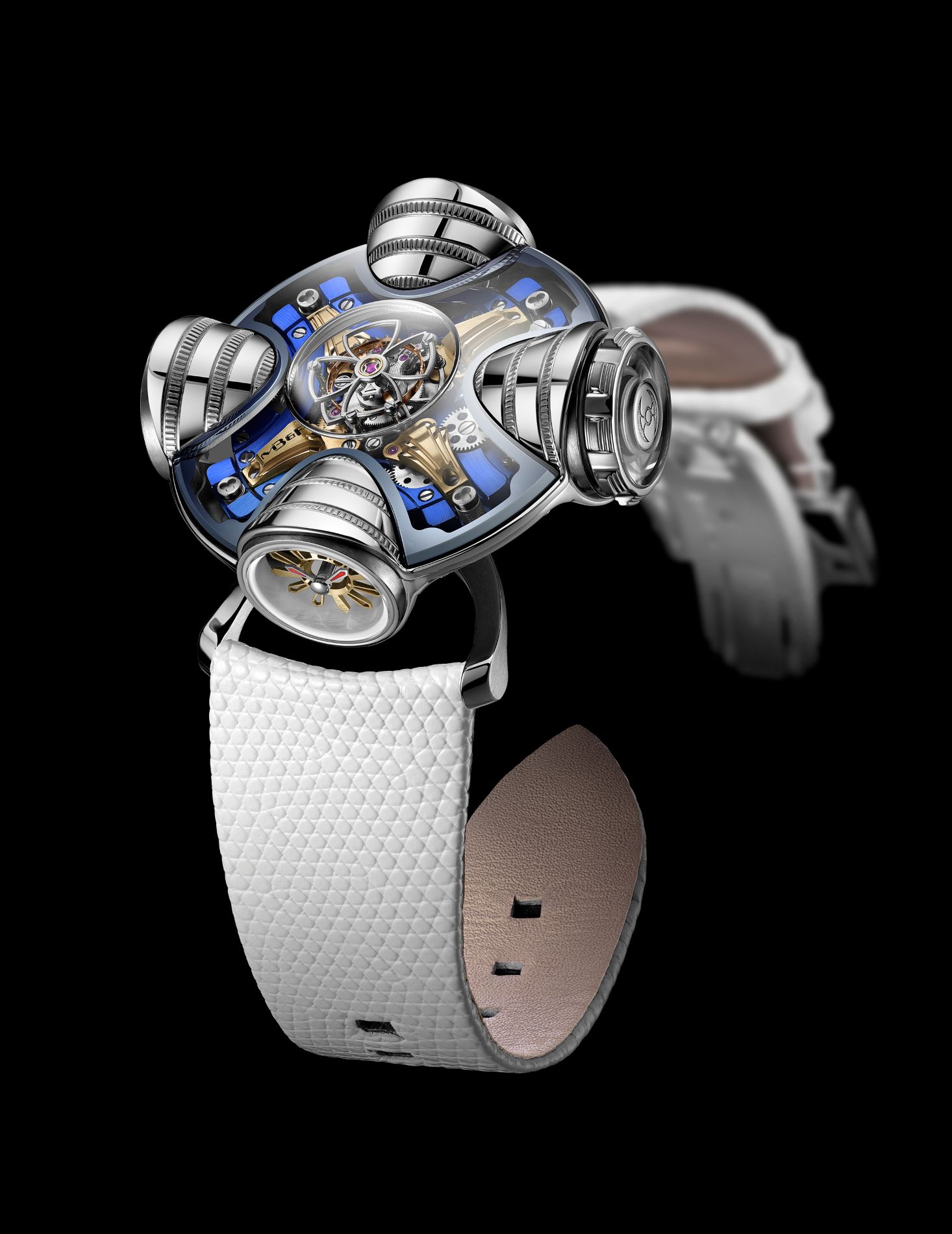 The 42mm grade 5 titanium case was built like micro-architecture, with curved walls, stacked sapphire domes, and a crown nearly ten millimetres wide, engineered with a complex multi-gasket “airlock” system to remain functional despite its size. Inside, an in-house manual movement drove a central flying tourbillon built around bevel gears, the engine suspended by four laser-cut steel springs derived from aerospace technology. The inaugural editions established a new aesthetic species: half timepiece, half inhabitable structure.