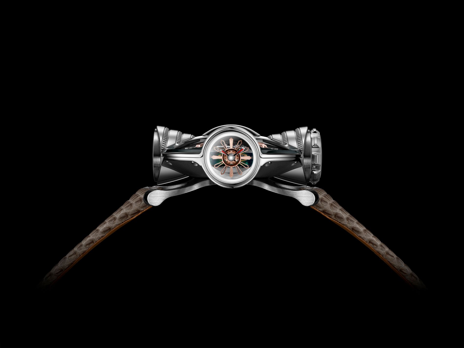 The engine under the roof was an in-house manual movement, three-dimensional in its construction and built around bevel gears. The flying tourbillon set the cadence at 2.5 hertz, or 18,000 vibrations per hour. A system dampener isolated the movement from shocks through four high tension suspension springs hidden between the engine and the lower shell. These were not simple wire coils but custom elements laser cut from a hardened steel tube with a chrome finish, a solution derived from aerospace technology.