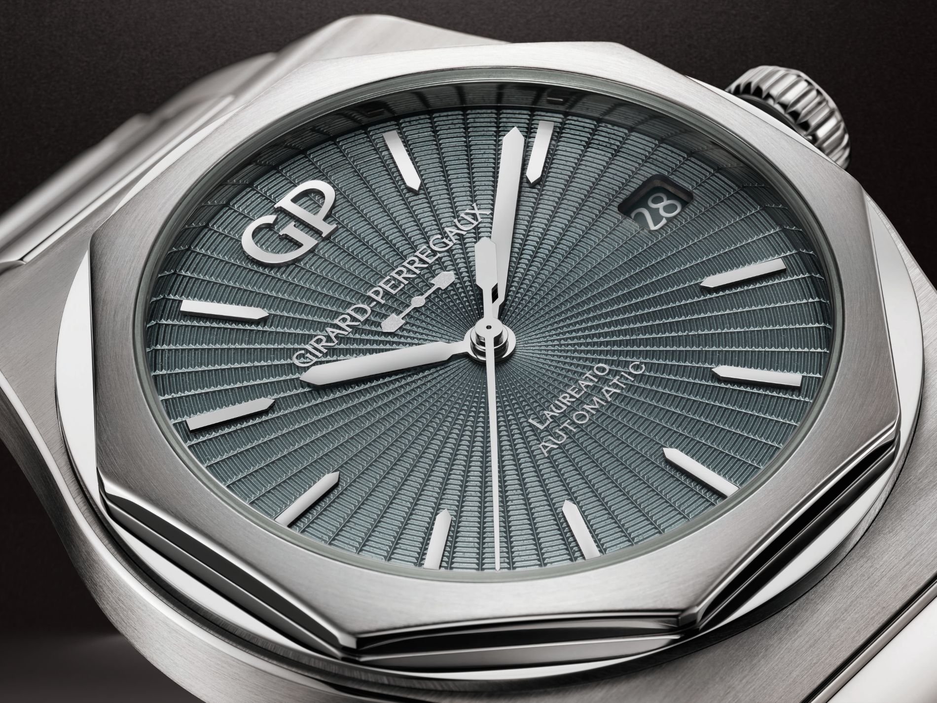 Thanks to its slim profile and integrated bracelet, the Laureato is known for its exceptional comfort and timeless style. Rhodium-plated baton hands mark the hours and minutes, while the slender central seconds hand features a counterweight inspired by the iconic Girard-Perregaux Gold Bridge—a discreet tribute to the Maison’s horological DNA. The date aperture at 3 o’clock is elegantly executed, with white numerals on a colour-matched disc, in perfect harmony with the dial.