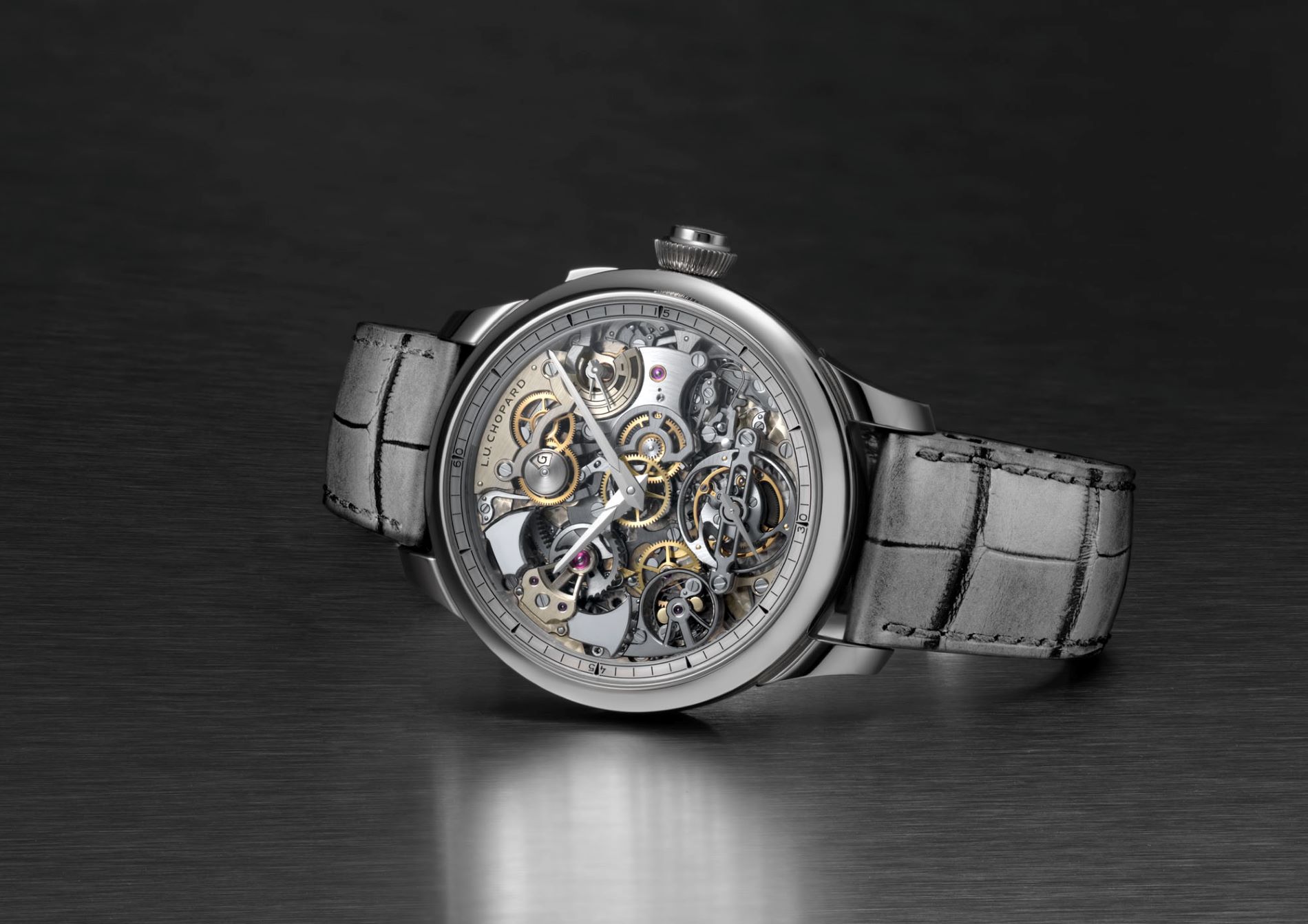 Housed in a remarkably compact 18-carat ethical white gold case measuring 43mm in diameter, the restrained curves and profile of the case design draw the eye directly towards the high precision L.U.C 08.03-L calibre, which is fully visible thanks to the open dial. At the 10 o’clock position, two polished steel hammers clearly indicate the chiming nature of this watch, which can be adjusted to three sonnerie modes – Grande Sonnerie (G), Petite Sonnerie (P), Silence (S) – via an ergonomically designed sliding selector switch located next to the winding and setting crown.