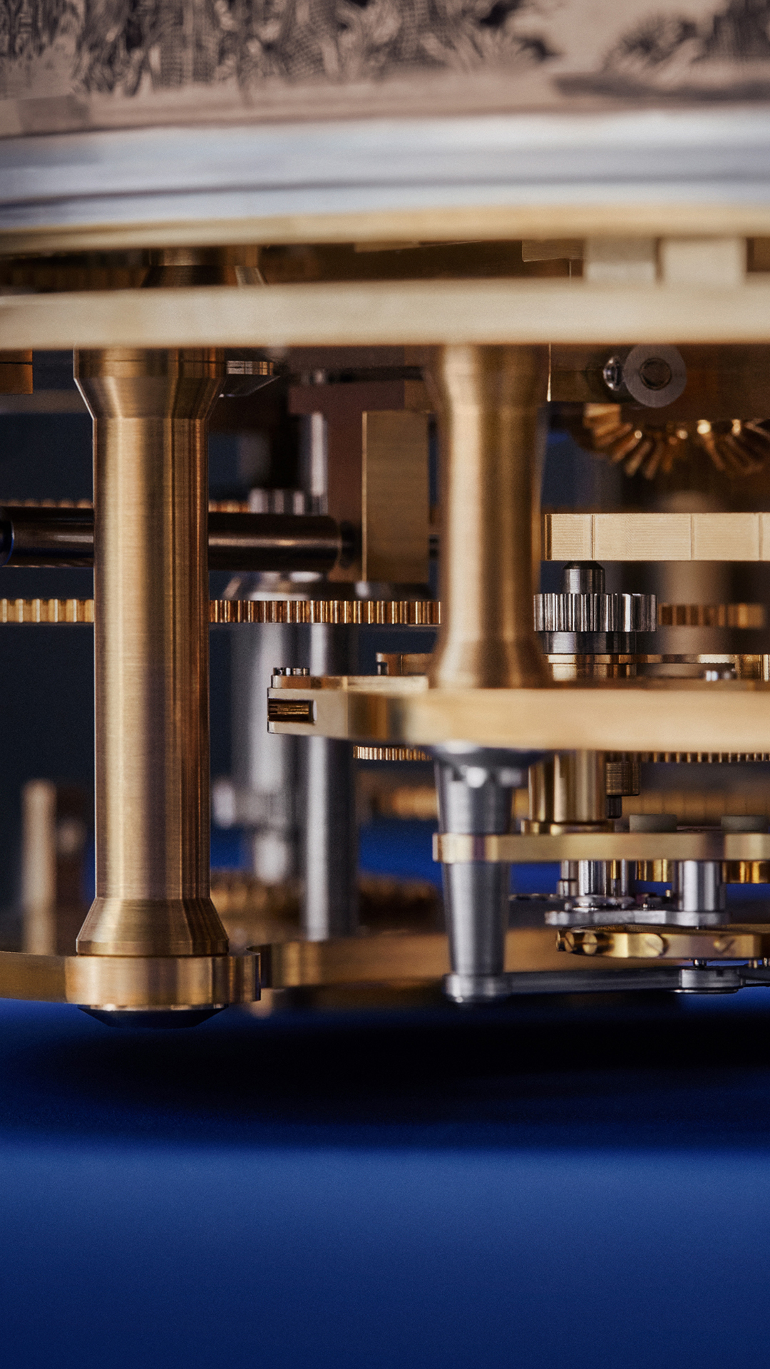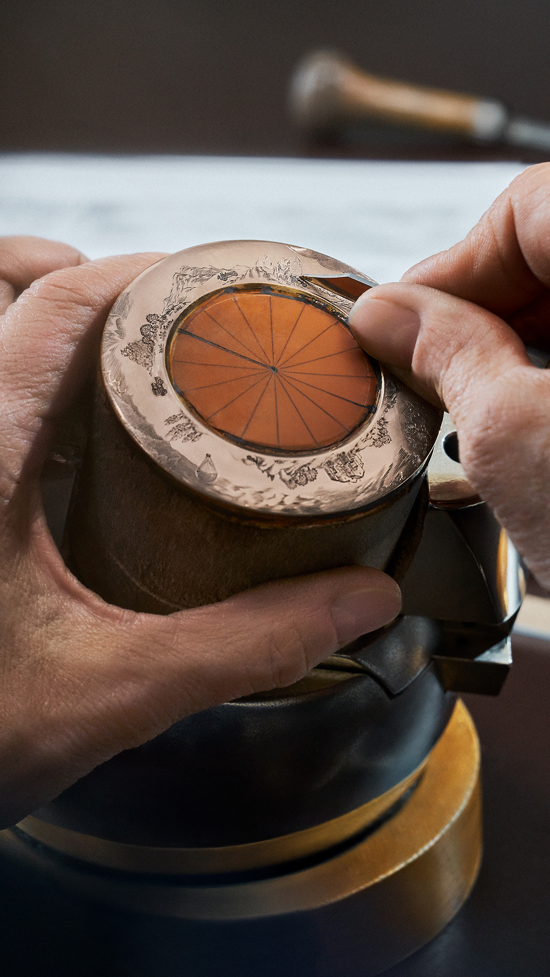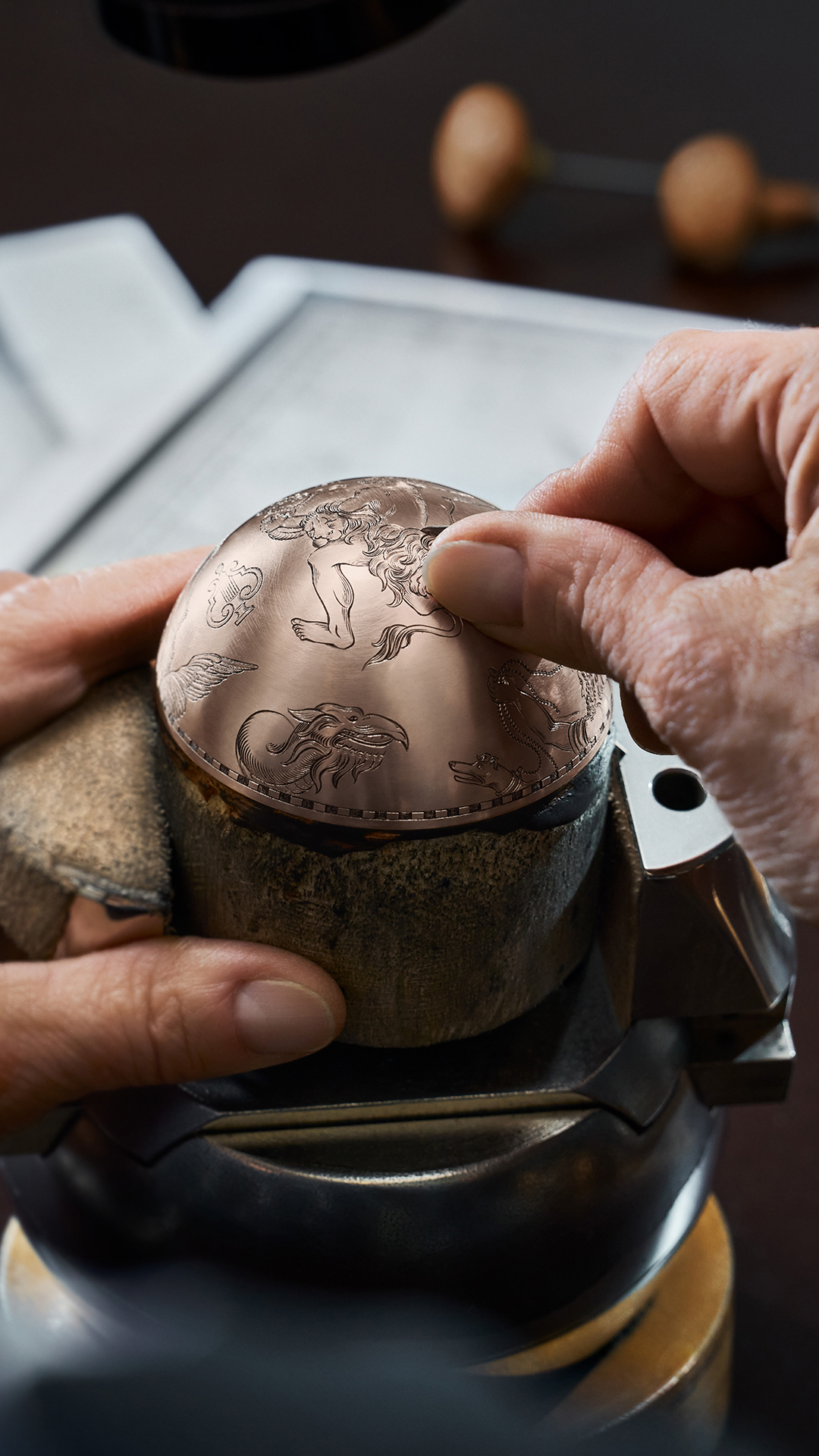 To fashion these intricate illustrations on three separate 5N rose gold rings, Denis Flageollet enlisted master engraver Michèle Rothen. Her task was monumental: over one meter of hand-engraved surface, with each line pulled from François Schuiten’s original pen drawings. Using a traditional burin and chisel, Michèle Rothen sculpted the entire panorama by hand, with results that rival the decorative clocks of the Late Renaissance.