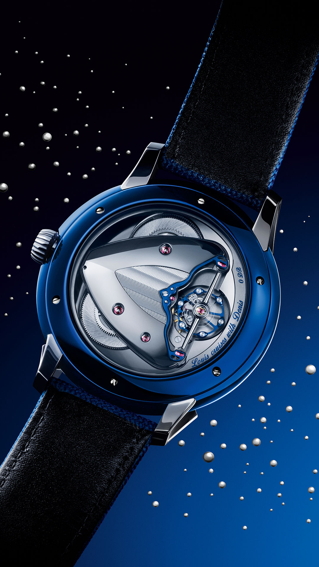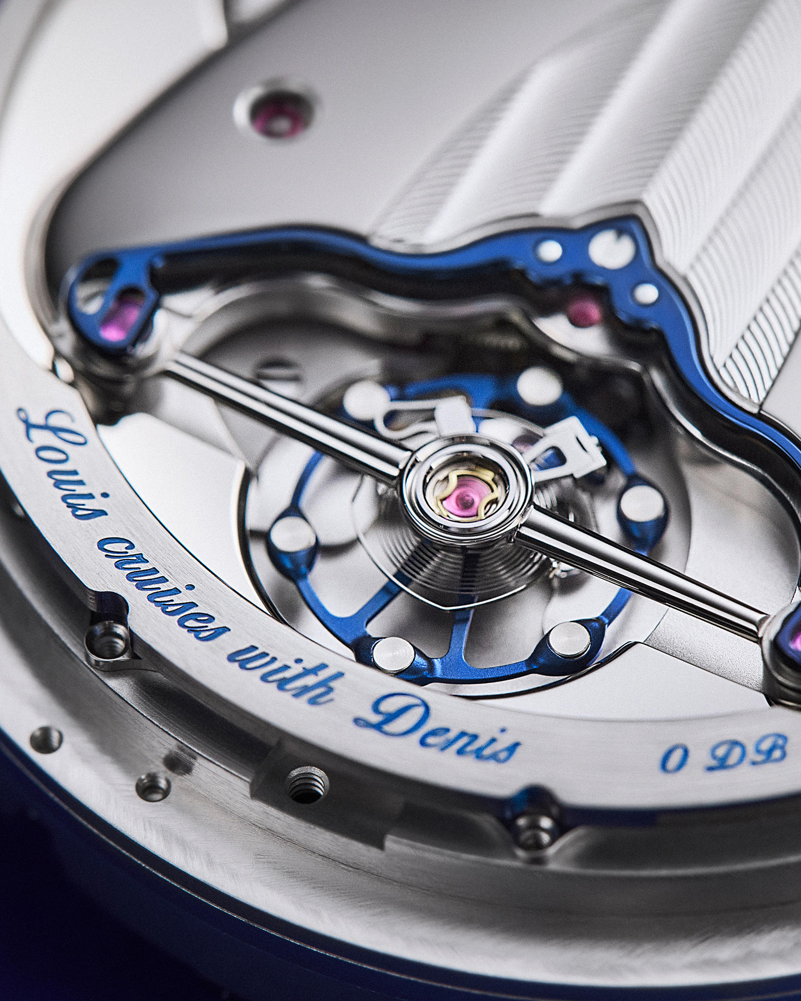 Turning the watch over reveals an open case back, offering an unobstructed view of the DB2507LV calibre. A tasteful nod to the collaboration, “Louis cruises with Denis” is engraved on the movement, alongside the individual limited-edition number, from 01 of 12 to 12 of 12—an intimate signature marking the exclusivity of the project.