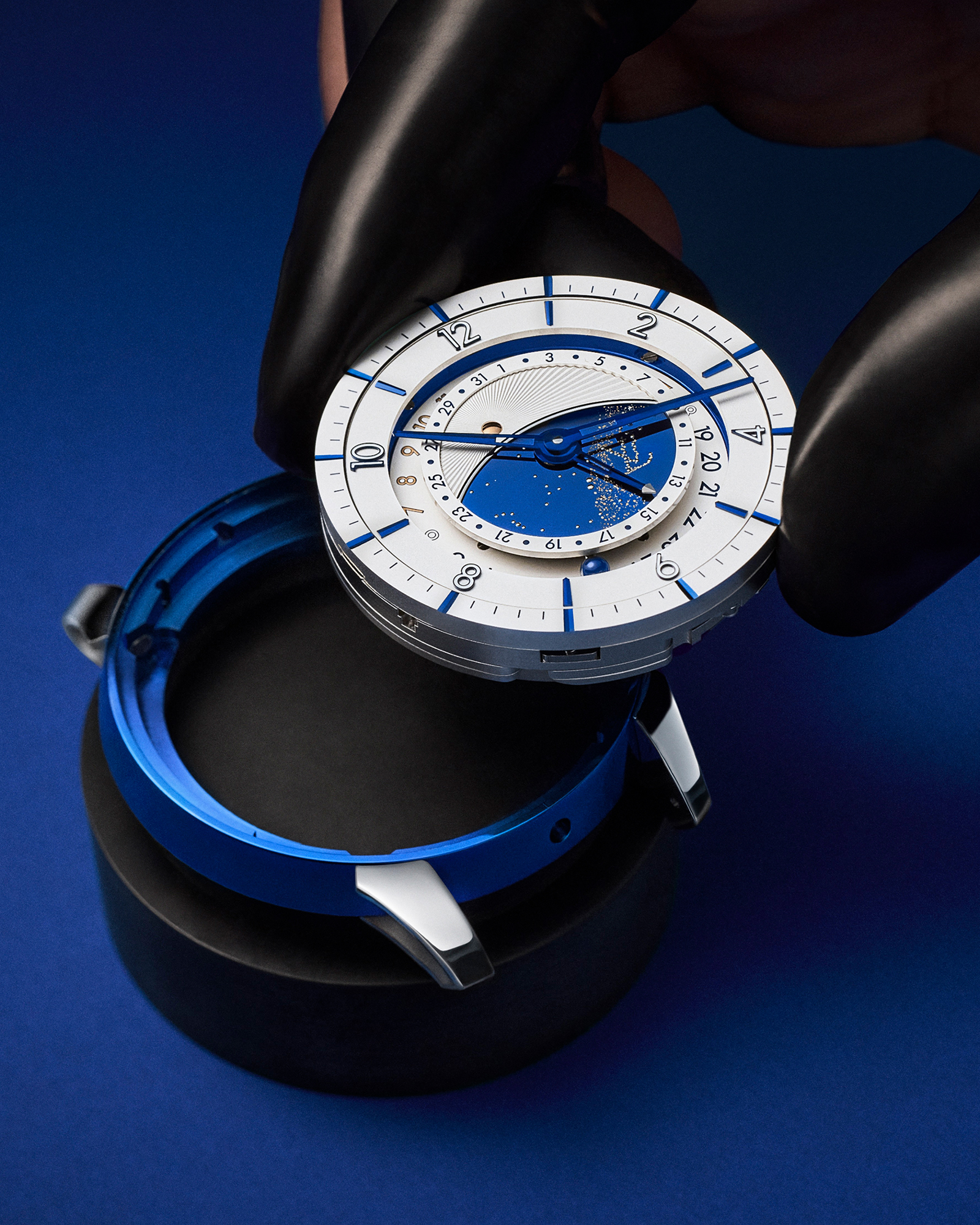 The blued-titanium case is contrasted by platinum lugs, whose brilliance heightens the depth of the blue while emphasising the architectural form of the watch. Each lug is hand-polished, with laser bead-blasted interiors that introduce a discreet textural contrast—an expression of meticulous attention to detail at every angle.