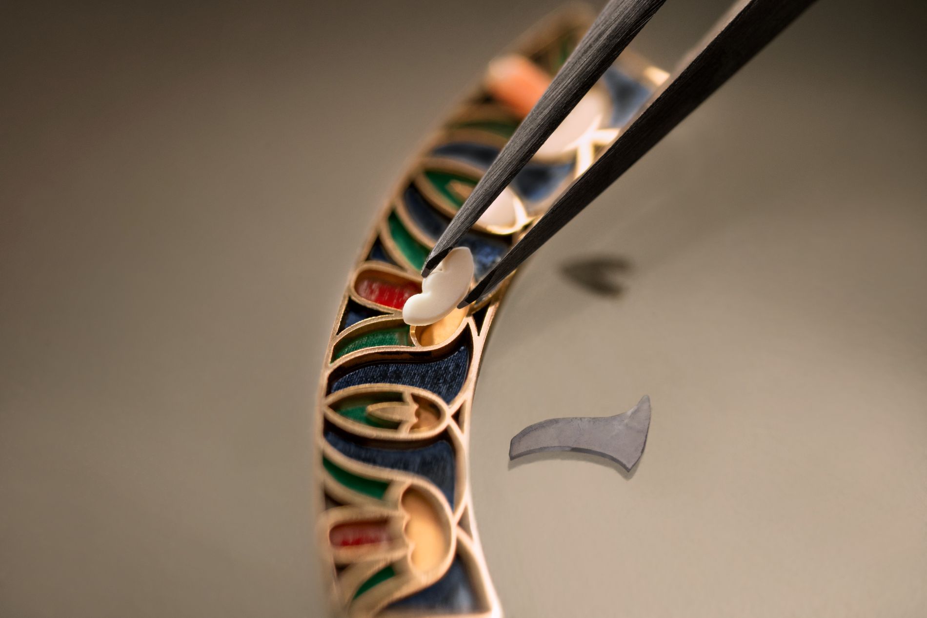 The complexity of the decorative crafts used on these watches required a dial construction composed of several elements, each corresponding to a specific technique. Positioned on a gold base plate, the centre features the effigy of a work representing one of the four civilisations, along with applique ornamentation reflecting the decorative arts characteristic of each culture. Around the periphery, a frieze completes the composition. In order to be assembled like a puzzle, these various components must be perfectly calibrated and adjusted with meticulous care so as not to alter the respective work of each artisan involved in the dial’s ornamentation.
