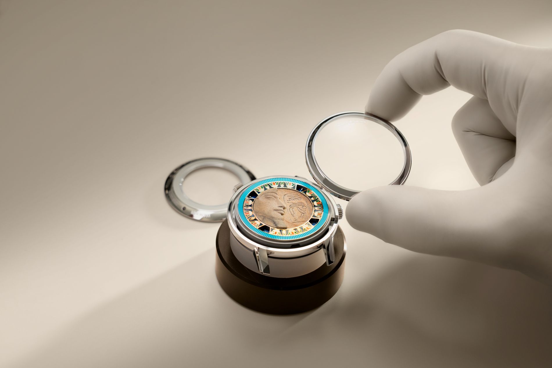 Four new Métiers d’Art Tribute to great civilisations pieces celebrate the Louvre Museum’s ancient masterpieces and the decorative arts associated with them, with a constant concern for historical accuracy and authenticity. In agreement with the heads of the Louvre’s departments, the reproduction work took into account the materials used for the original works, namely stones of the same origin and quality. The decorative crafts highlighted in these pieces reflect Vacheron Constantin’s ongoing commitment to preserving and showcasing traditional skills such as glyptics, micro-mosaic, engraving, enamelling, marquetry, gilding and miniature painting.