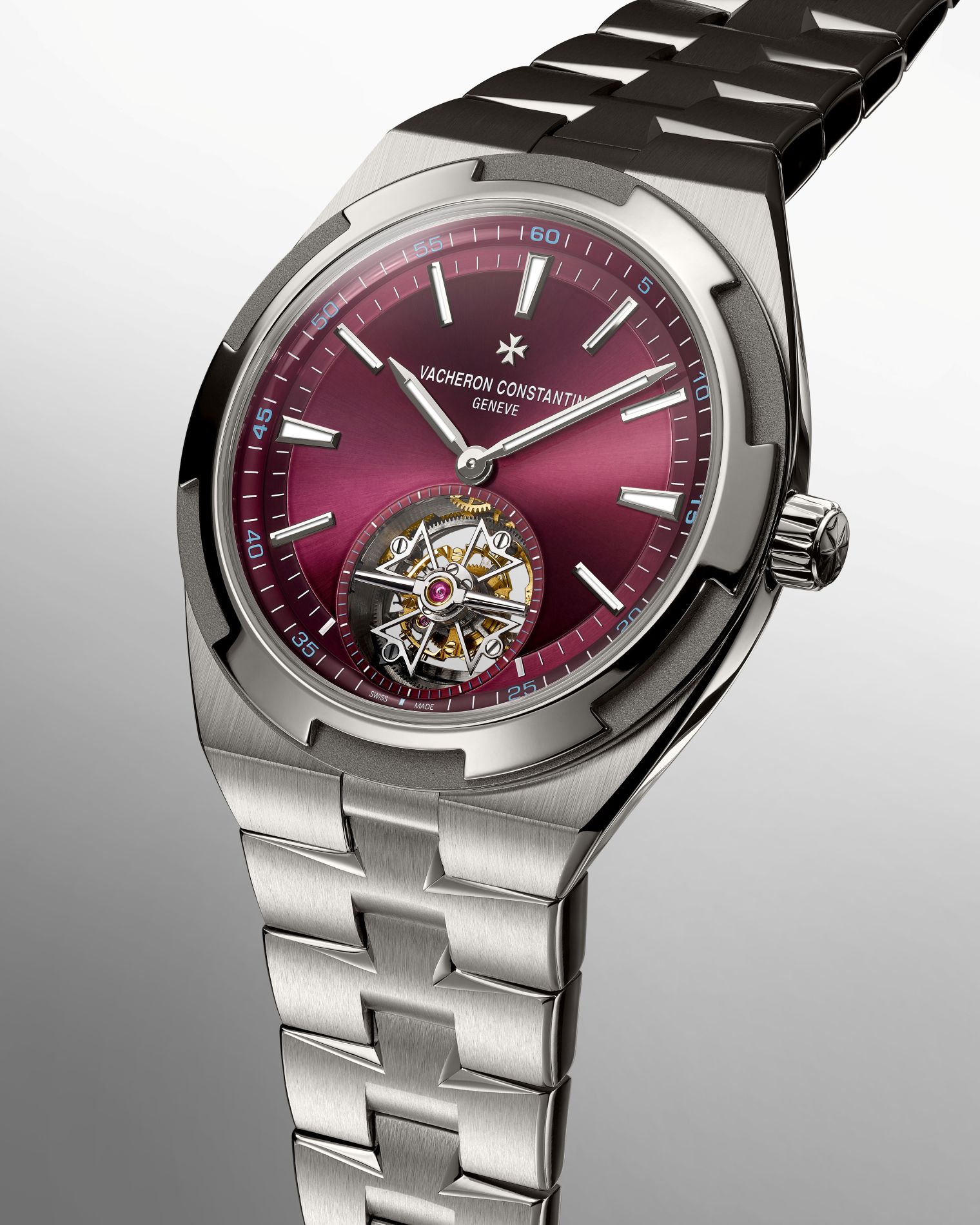 Vacheron Constantin enriches its Overseas collection with a titanium tourbillon model featuring a deep red dial. A material perfectly in keeping with the sporty and elegant spirit of the collection, titanium is a marvel of robustness and lightness. Certified with the Hallmark of Geneva and equipped with the ultra-thin calibre 2160, only 5.65 mm thick, the watch features a tourbillon regulator and fits comfortably on the wrist.
