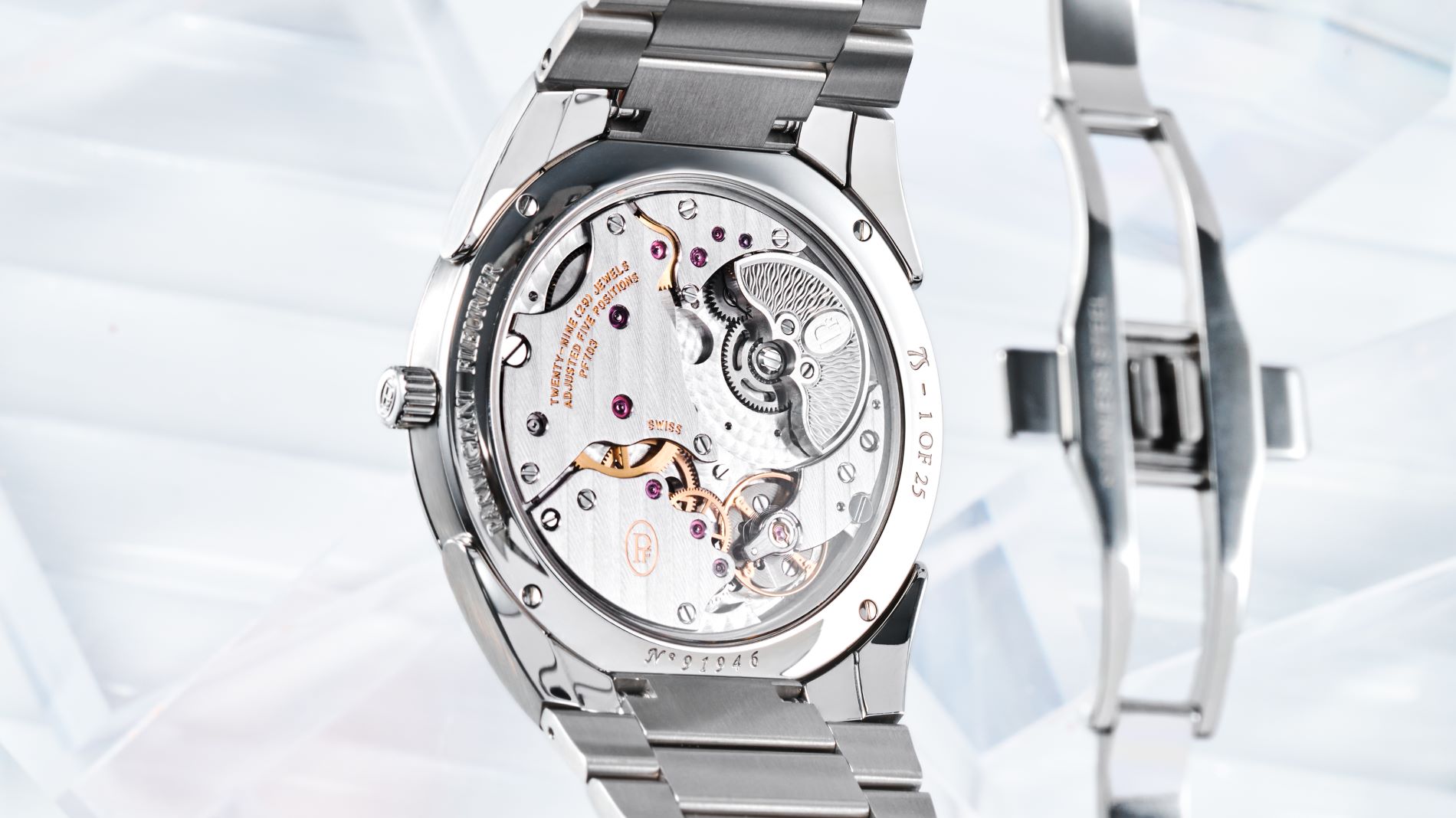 Caliber: PF703 Winding: Automatic Power-reserve: 48 hours Frequency: 3 Hz – 21’600 Vph Jewels: 29 No. of components: 176 Total dimensions: Ø 30.6 mm Thickness: 3.07 mm Decoration: Côtes de Genève, Perlage Oscillating weight: Grain d’Orge guilloché platinum 950 micro-rotor