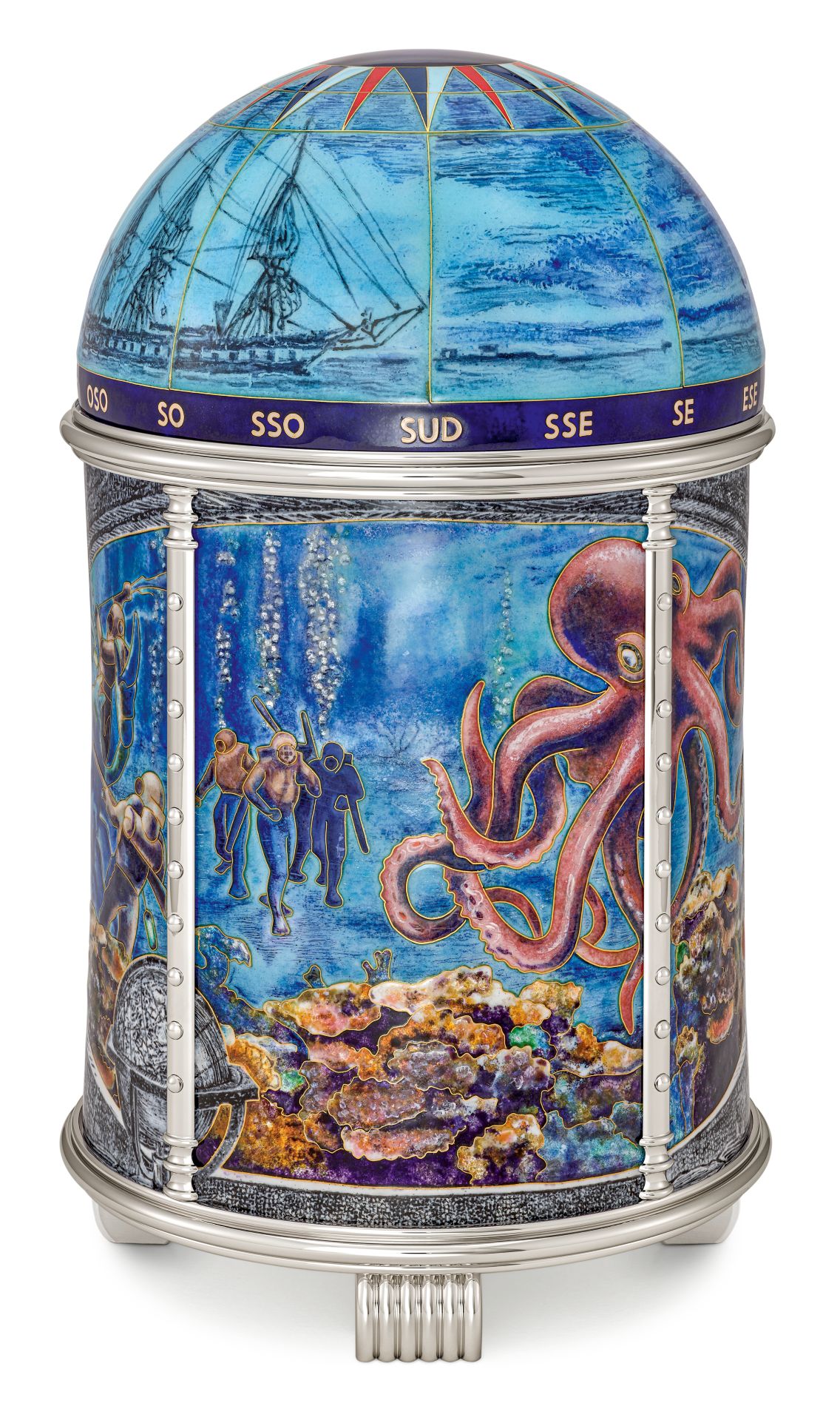 The border of the upper panel and the bezel present an engraved cord motif. The observer may also recognize, in the form of appliques in vermeil (silver gilt) decorative elements borrowed from the historic clock: the three rosettes located in the corners and at 12 o’clock, the acanthus scrollwork surrounding the Calatrava cross, and the four winged lions enthroned on the clock’s feet.