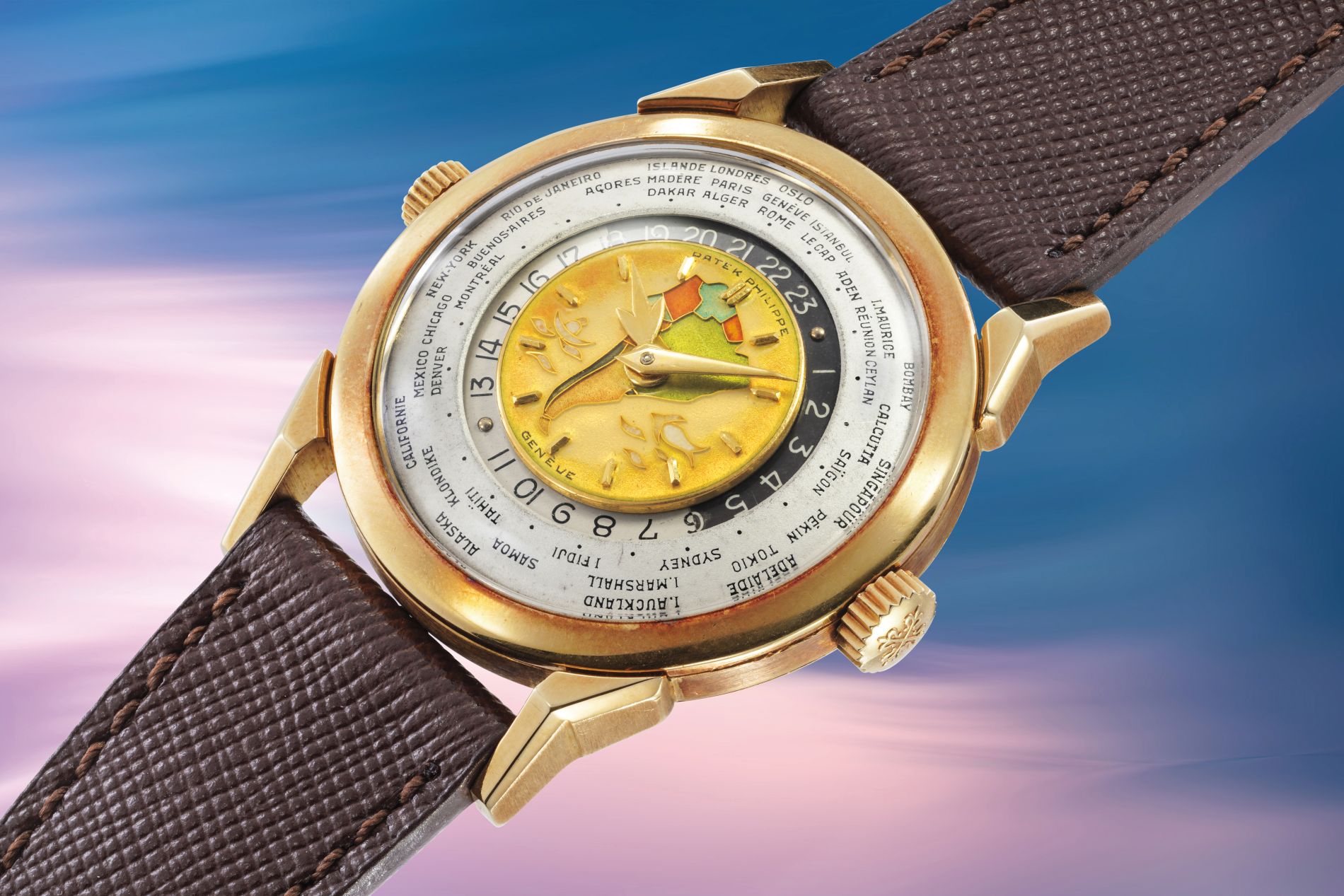Phillips in Association with Bacs & Russo is honored to announce the offering of one of the most visually captivating and historically significant wristwatches ever made: an 18k yellow gold Patek Philippe Ref. 2523 two-crown world-time wristwatch with polychrome cloisonné enamel dial depicting a map of South America.