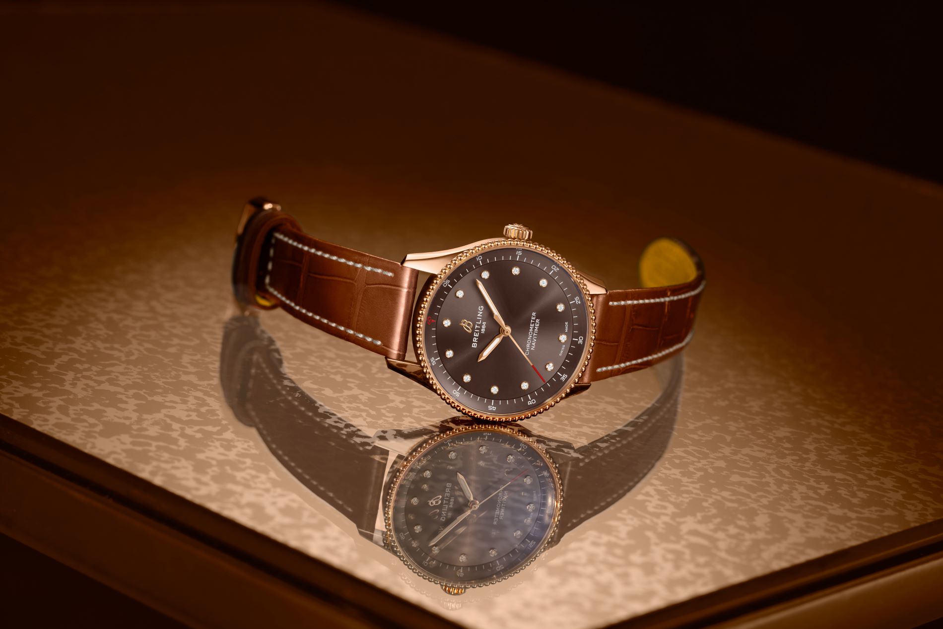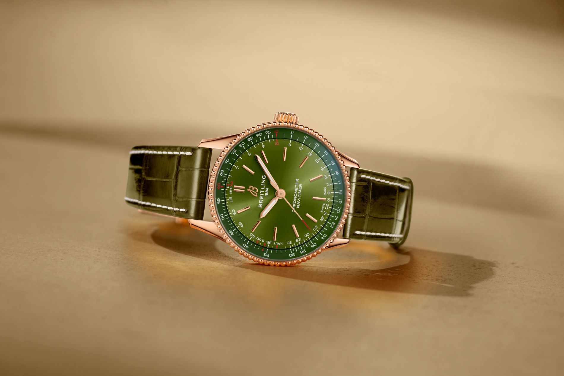 The Navitimer 32 comes in an all-brown dial, a matching outer slide rule and with subtle, elegant diamond hour markers. It’s the smallest of the three, and comes with a thermo-compensated SuperQuartz™ Breitling Caliber 77, enabling the slimmest case profile from the three at just 8 mm. Matching the dial, the strap comes in brown alligator with a red-gold tang-type buckle. In contrast to the classic knurled bezel of the chronograph, both time-only Navitimers come with the beaded bezel—reminiscent of the very first Navitimers of the 1950s.